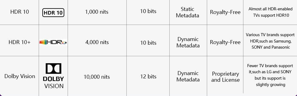 Dolby Vision: Includes dynamic metadata, advanced HDR color