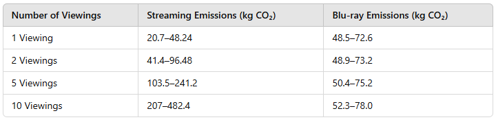 Streaming emissions are cumulative: you emit the same amount of CO₂ for every single viewing. Blu-ray’s emissions, on the other hand, are a one-time manufacturing cost, so the per-viewing footprint decreases with each additional run-through.
