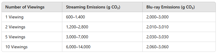 For a 2-hour movie, Blu-ray becomes the more sustainable option after 3–5 viewings, depending on playback emissions and manufacturing efficiency.